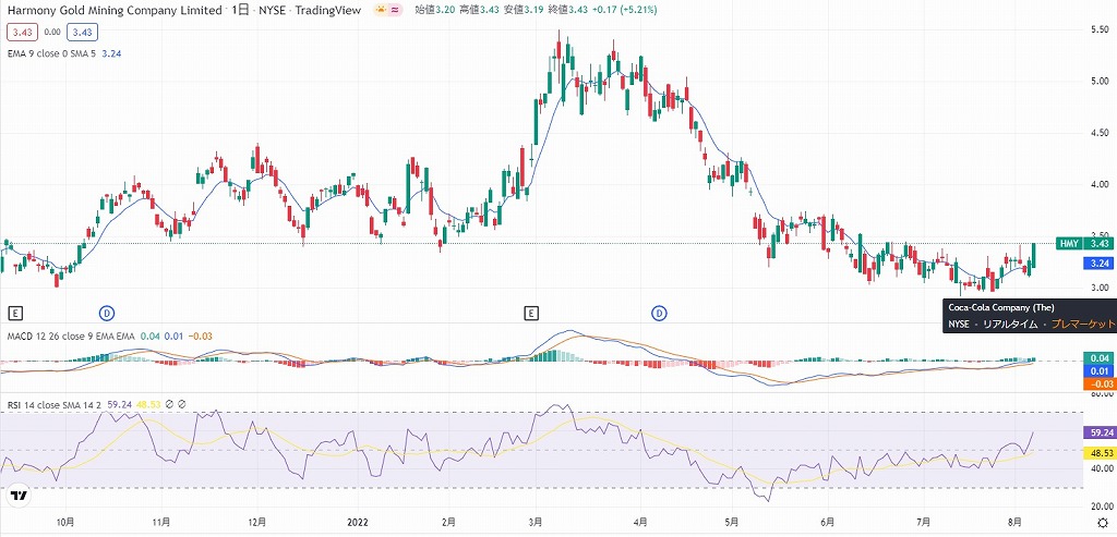 NEW HMYが2022.8.5に株価が反発を開始+5.21%で3.43$と大幅に上昇。